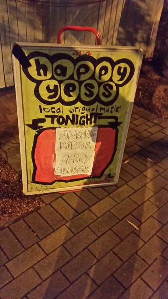 So Saturday night rolled around, and Angus and I (and Kim, of course) made our way down to the Happy Yess. I was quite excited to be gigging as a musician again, especially when I saw this out the front: