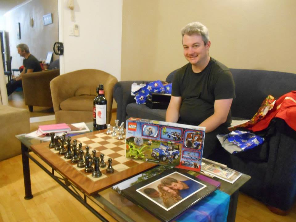 My sister got me an awesome one from India, which sits on our bookshelf, and my wife has now bought me two chess sets. For my 30th birthday she got me an awesome set. About a foot and a half by a foot and a half, with classical wooden pieces and drawers to put them in. I thought that was the coolest and biggest set ever.