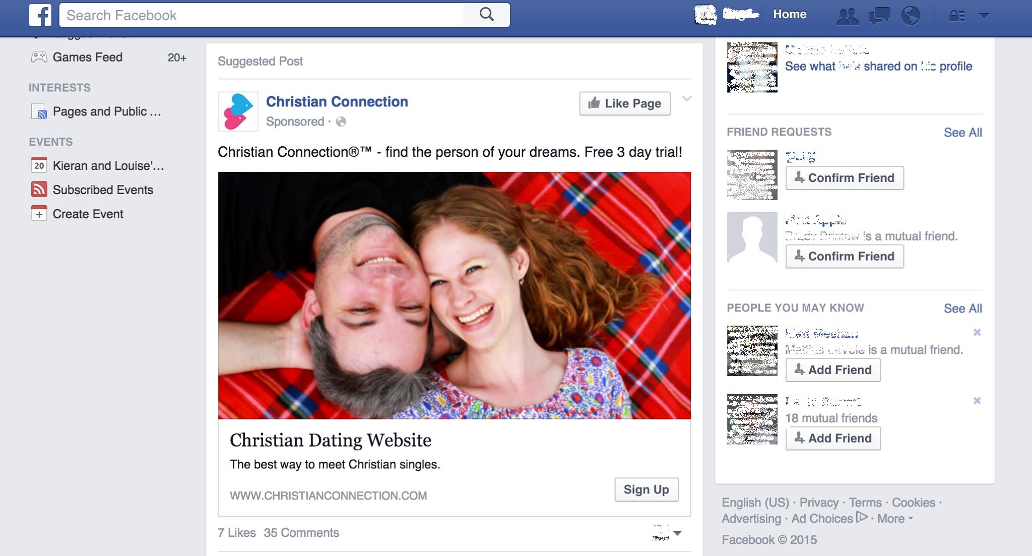 Poor guy. I mean it’s hard enough having Facebook identify you as Christian and single and therefore obviously in need of Christian online dating services, but to have that ad backed up with your apparently happy, married and thus evidently better Christian friends is going a bit far. I’m sure it’s just a coincidence.