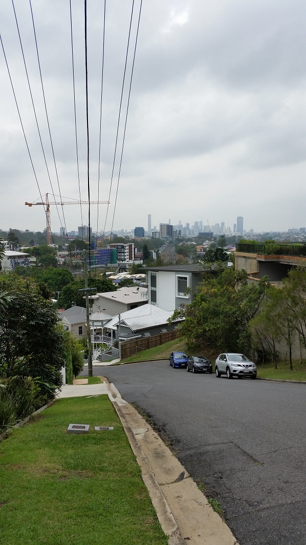 The view from our front door depends on which way you look. We live in a block of units built half-way up a hill. Looking south west we have a nice view over the Indooroopilly valley down towards the river. Looking north there’s just the hillside unless you climb to the top, up to Swann Road. From there you can see over to the city. It’s a peaceful suburb, but not a quiet one. At most times of the day you can hear traffic from Moggill Road. There’s usually plenty of birdsong coming from the trees that line Clarence Road, but they’re drowned out by the traffic. About every fifteen minutes everything gets drowned out by a train. And for some reason there always seems to be a motorcycle around that needs its muffler fixed. Or possibly its rider.
