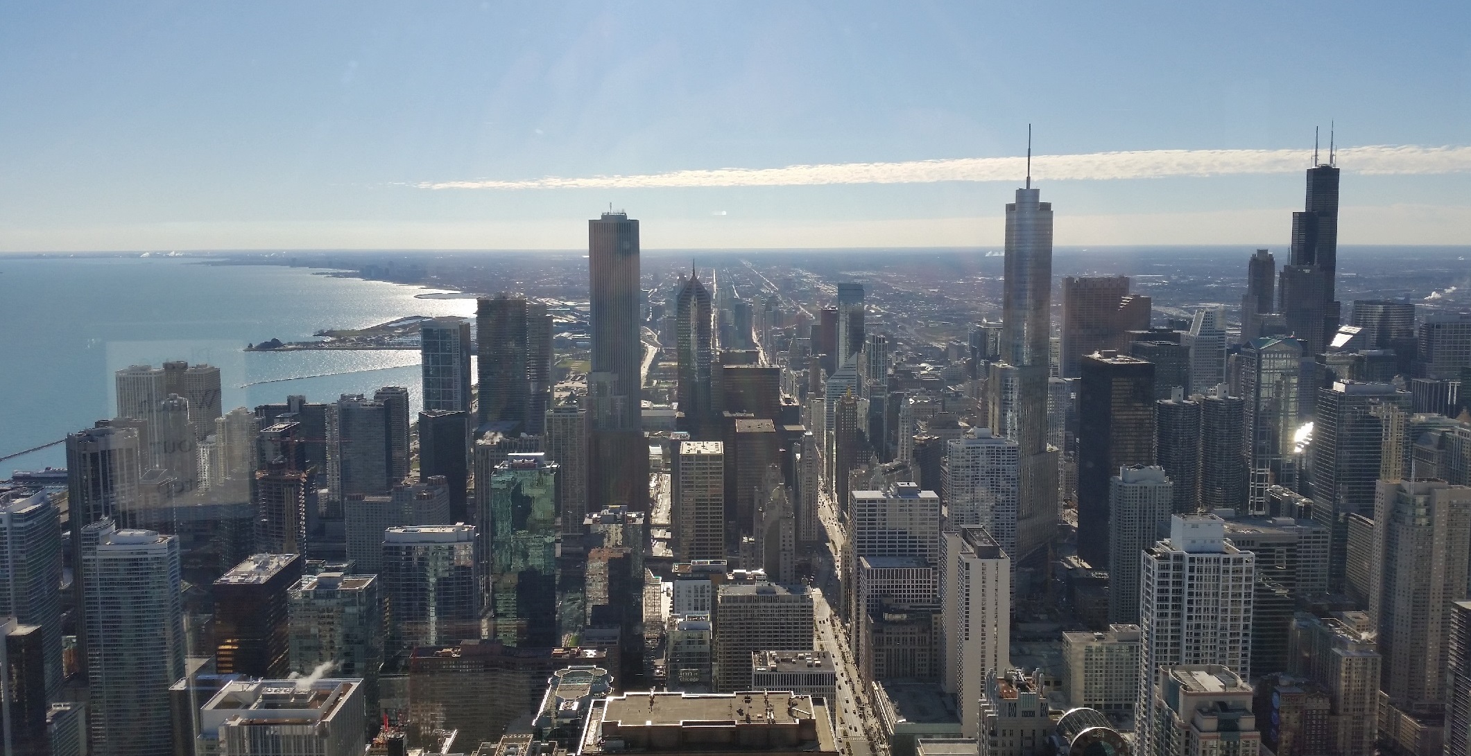 Downtown Chicago has everything you would expect from a major American city; intense traffic, people moving in every direction in an awful hurry and the constant rattle of the public transport system. To escape it all, we took a trip up the John Hancock building. It was something like twenty dollars each to enter the viewing lounge on the top floor, but for the cost of a hot chocolate each we could sit in the restaurant on the second highest floor and enjoy exactly the same view. So that’s what we did and the view was awesome.